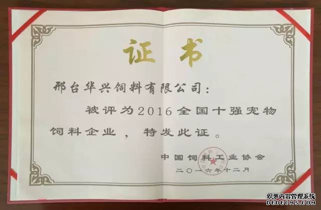2016年12月9日,中國飼料工業協會第七次會員代表大會在北京召開,會議對2016年度中國飼料工業協會先進集體及先進工作者進行了表彰, 華興公司榮獲“2016全國十強寵物飼料企業”稱號。